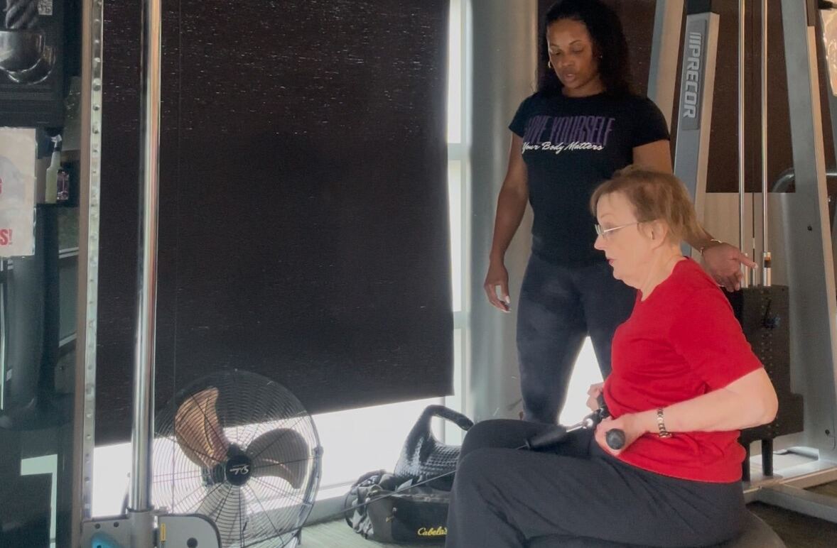 Through her “Functional Senior Living Program,” Dr. Tosha Bell (back) is helping her client redefine what aging well looks like, overcoming scoliosis and dyspnea challenges through evidence-based movement, mindful coaching, and functional strength training.
